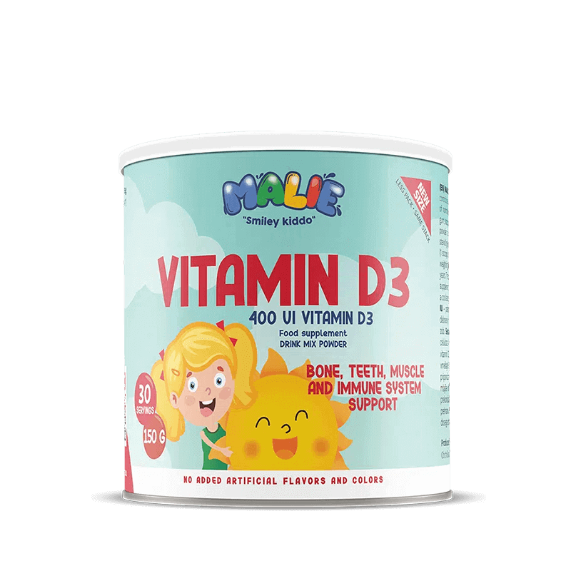 MALIE Vitamin D3 – gardaus braškių skonio vitamino D3 gėrimas vaikams nuo 4 metų, skirtas kasdienei rutinai. Jis padeda palaikyti normalią imuninės sistemos veiklą, padeda palaikyti normalią kaulų ir dantų būklę, prisideda prie normalios kalcio ir fosforo absorbcijos, normalios raumenų funkcijos ir normalios ląstelių dalijimosi funkcijos. Formulė be cukraus, be konservantų, dirbtinių kvapiųjų medžiagų ir dažiklių, todėl tai patogus ir saugus pasirinkimas kasdieniam vartojimui. Vitaminas D3 yra gerai ištirtas vitaminas, svarbus kalcio apykaitai ir normaliai kaulų būklei.